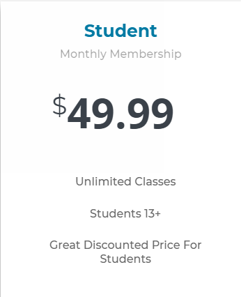 Includes unlimited classes, low price for students ages 13 and older.